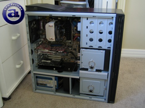 The Antec P182 is truly a cabler's dream -- especially for those who are lazy like me and simply use what's available out of the box without cutting things up. I did change a few components after taking the photo above, such as the most obvious CPU heatsink/fan swap and a less noticeable hard drive change (Which made no difference visually anyway). I ran the Arctic Cooling Freezer 64 Pro's power connector behind the opening above the ATX 4-pin connector to a Zalman Fanmate 2 controller and then the cable from the fan controller through the opening above the RAM slots to the motherboard 3-pin connector.
