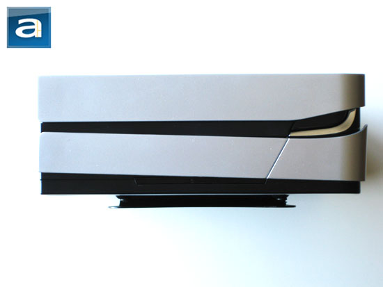 Apex incorporates a relatively simple and clean front face for the MW-107 mini-ITX chassis, as shown in our photo above. The front bezel makes a 90 degree corner with the rest of the case on the left side, but rounds off on the right for a sleek and stylish asymmetrical design. Measuring in at 2.8" (7.1cm) in height, 8.7" (22cm) in length, and 7.3" (18.5cm) in width excluding the front bezel, the Apex MW-107 is certainly one of the most compact mini-ITX cases in the market today. The Apex MW-107 is designed for users who are not looking to incorporate any desktop components into their mITX build for maximum portability and minimal size. The uniquely shaped silver colored faceplate features two plastic doors to hide a slim optical drive at the top, followed by two USB 2.0 ports and two 3.5mm audio jacks grouped behind the bottom cover. Both plastic doors are bottom hinged; and are held in the closed position by small magnets. While the covers are very lightweight, its plastic door and hinge construction makes it feel flimsy and cheap; creating limited durability perception to the end user -- not a good thing. Other than that, the rest of the MW-107 is black in color, which will appear shortly on the subsequent page of this review with a photo showing the doors in open position. Between the upper and lower section on the right hand side of the chassis is a blue power LED and red hard disk activity LED, hidden behind a darkly tinted window to look uniform with its adjacent panels. It also doubles as the power button. A silver colored strip extends around the lower perimeter of the aforementioned. The brand name is not found anywhere on the chassis.