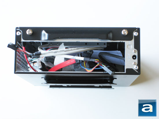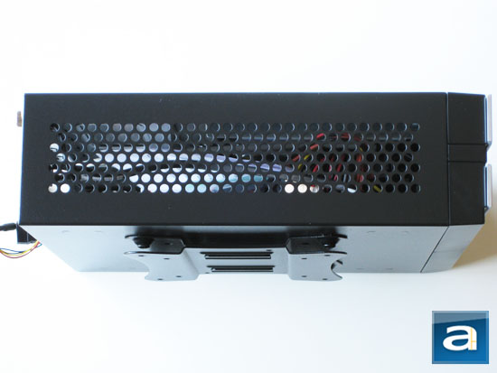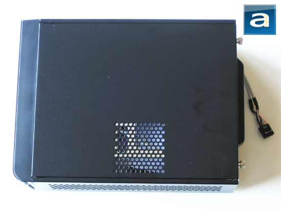 To give you an idea of how small the Apex MW-107 is, our photo above should do the job clearly, haha. If you disagree with my assertion, please keep it quiet, because you know you are wrong and I am right (Just kidding!). Anyway, it is interesting to point out that the entire rear panel of the case is actually not significantly larger than the rear I/O panel of a mini-ITX motherboard itself -- which is the same as a standard ATX motherboard -- this itself is pretty awesome in my opinion. However, due to limited height of the MW-107, it has no room to accommodate any expansion cards. On the right of the I/O panel opening is a DC power input jack, routed to the DC to DC converter board located inside the chassis. As mentioned earlier in this review, a 60W power brick is included out of the box. Two thumbscrews secure the top cover in place; with a protruding handle integrated into the center of the upper panel to allow easy release by the end user. Meanwhile, the left and right side panels are permanently secured by rivets during manufacturing. Installation only requires removal of the upper panel, making the Apex MW-107 simple and intuitive to use to the end user.