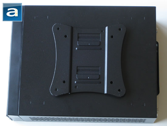 While bottom of cases usually aren't particular exciting things to discuss, the Apex MW-107 has a few features that are certainly worth mentioning. The most obvious being the metal VESA mounting brackets -- the MW-107 can be attached to the back of your computer monitor to save space. That said, the MW-107 can still be easily detached from your monitor at any time by sliding the chassis in the opposite direction of the clip locking position. Apex also includes four self-adhesive rubber feet out of the box for the user to install as they wish; their designated positions are marked by four engraved corner brackets on the bottom panel, which can be seen in the picture above. The rubber feet are tall enough to prevent the chassis VESA bracket from touching its residing surface, but short enough so that it does not interfere when attached to its corresponding mounting bracket. It is quite convenient, and well designed by the manufacturer.