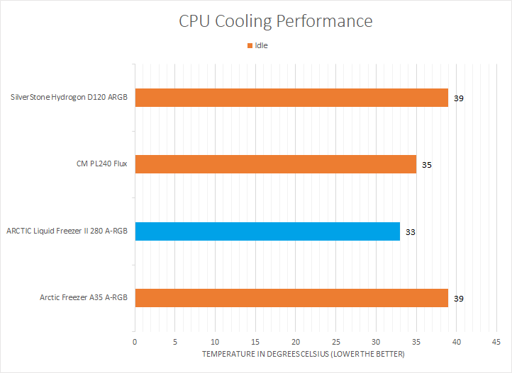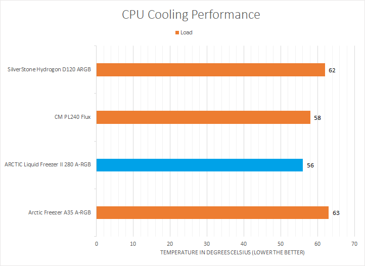 For the first test, I let my computer sit idle for a while. After about an hour, I shook my mouse to wake my computer up. We can see the ARCTIC Liquid Freezer II 280 A-RGB sat at around 33 degrees Celsius, which outshined all the compared coolers. This was 2 degrees cooler than the Cooler Master MasterLiquid PL240 Flux, which has already been proven to be a capable AIO cooler. The Liquid Freezer II 280 A-RGB was also 6 degrees cooler than both the SilverStone Hydrogon D120 ARGB and ARCTIC's own Freezer A35 A-RGB. While this is a good start, idle tests do not give a full representation of the cooling capabilities, thus leading us into our load tests.