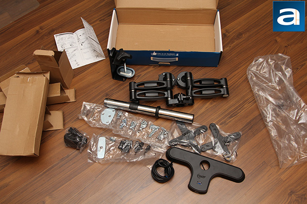 The box opens via a flap at the top. Inside, all its contents are neatly laid out in their respective cardboard boxes and plastic bags, which is pretty convenient. I am also happy to see there are no Styrofoam brackets to deal with. I am no environmentalist, but I just feel kind of bad every time I chuck them in the trash; this is not to mention the squeaks are so nerve racking. Once out of the box, you will find everything you need to get going; this includes the base and corresponding desk clamp accessories, center rod, arm, two VESA mount brackets, AC adapter for the USB 3.0 hub, two long strips of plastic bags for the hardware, and an instruction manual. ARCTIC has done a wonderful job in organizing everything in my opinion. As I have just said, the installation hardware are all in two long strips of plastic bags, with each compartment labeled, which is a big help during the assembly process. The manual is also clear enough to make a relatively setup task even simpler.