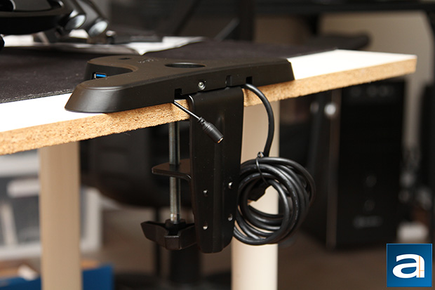 To start, you will need to put the base assembly together. Depending on how you install it, the mechanism consists of two of more components. The common denominator is desktop portion of the base, which features ARCTIC's logo at the top, along with four powered USB 3.0 ports. There is one port on the every exposed side; which includes the left, right, front, and even the top -- an interesting design choice in my opinion. The power and USB lead out cables are routed through the back, which connects to an included AC adapter and your computer, respectively. The ARCTIC Z2 Pro can be attached to your desk either on the edge or through a hole. Since there are no holes on the desktop surface I plan to install this monitor arm on, I went with the classic edge installation, in which you can see in our photo above.