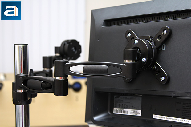 To set the height, simply loosen the screws on the center ring, and slide it up or down. Once the desired height is found, tighten the screws again. Next, drop the actual arm -- which ARCTIC refers to as the "adapter bracket assembly" -- through the top of the pole, and rotate the plastic handle to tighten. The arm itself is composed of three major segments for each monitor, as you can see in our photo above. Intuitively, you can see it can provide quite a bit of freedom in all directions other than the height, which we have configured earlier.