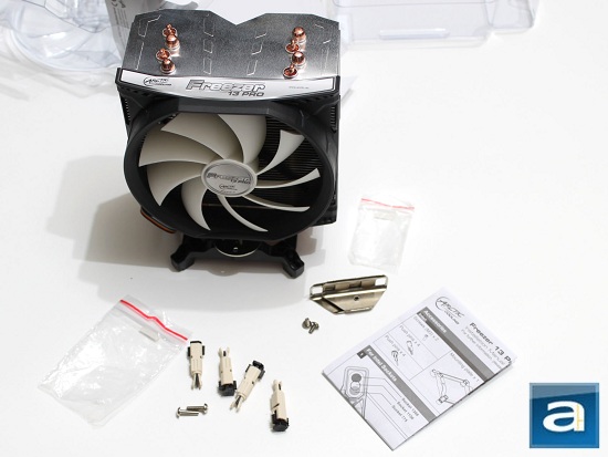The packaging of the Arctic Freezer 13 Pro comes in two halves -- the front half clipped onto the back half via plastic buttons in clamshell form. Once opened, you will be greeted with the Freezer 13 Pro itself, as well as four push pins and two M3 screws used for attaching it to the mounting plate on Intel CPUs. Also, two lugs and two additional M3 screws are presented to those AMD CPU fanatics. Last but not least, an Ikea-like instruction poster is folded multiple times to be fitted in the packaging along with the Freezer 13 Pro. That is really all there is to it -- nothing more, nothing less. Sometimes, simplicity may be a shocker.