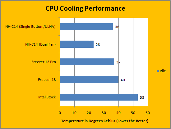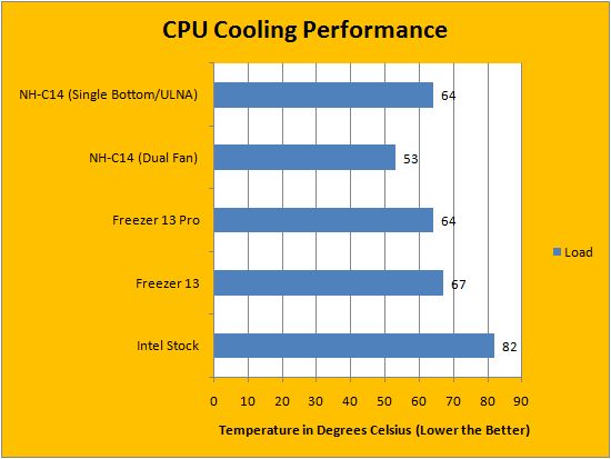 As we can see from the chart above, there was not much of a competition in terms of performance between the Freezer 13 Pro and its brother, but still came out significantly better than Intel's stock cooler by a 16c margin. As a reference, I have also included the best and the worst case scenarios of the Noctua NH-C14 in terms of temperature readings. The NH-C14 in Low Profile ULNA mode performs marginally better than the Freezer 13 Pro. At maximum speeds, the NH-C14 has the Freezer 13 Pro beat by 14c.