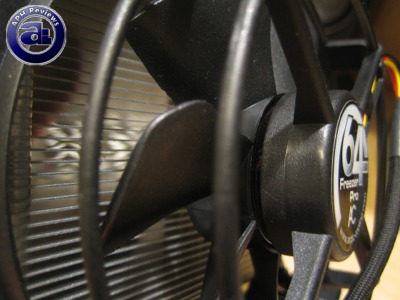 The fan is a 'reverse fan', held by the fan cage. Similar implementation is used by Thermaltake's RX-K8, which rattles and shakes our whole case as well as generating an immense amount of noise. When I noticed that the Freezer64 Pro uses the same technique, I kind of wondered how well this heatsink will perform. The good news is, during our tests the fan is very quiet and generates minimal vibrations. There are vibration dampers at all four corners of the fan. Screws were used on the Thermaltake RX-K8, which we had to tighten up. To be honest with you, I can still hear a light 'whoosh' with the Freezer64 Pro installed in my computer, hooked up directly to our motherboard's 3-pin connector.