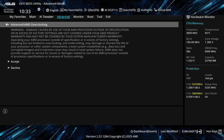 As mentioned earlier, there seem to be two distinct sections in the BIOS that show the manual overclocking sections, with the more extreme changes located under the Advanced tab. In fact, every time you enter the AMD Overclocking section, you will see this warning message that operating your processor outside of factory settings may damage your processor. In these cases, it is possible any damage from overclocking may not be under warranty coverage. To proceed, you must click Accept. Selecting Decline leads you to a blank page.