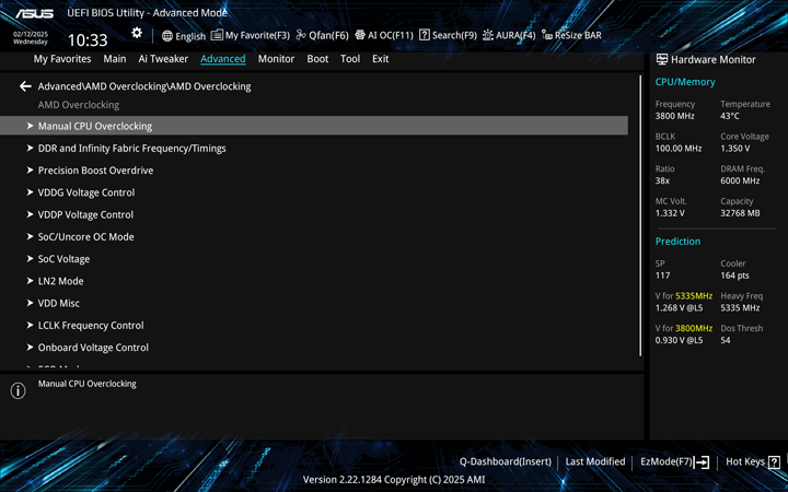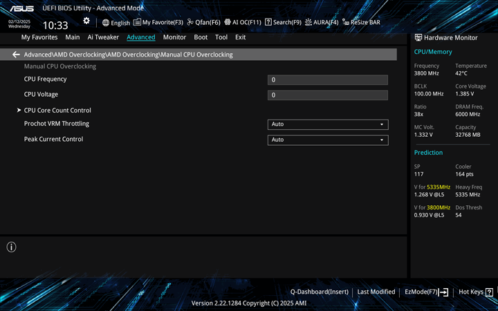Once you enter the AMD Overclocking page, you will see all sorts of more defined overclocking sections, including areas to overclock your CPU, memory, and the Infinity Fabric frequency timings. You can set different voltages to either overvolt or undervolt, as well as set up the motherboard for different cooling modes, such as with liquid nitrogen. The Manual CPU Overclocking page is more of an old school approach, with the ability to set the frequency and voltage directly.