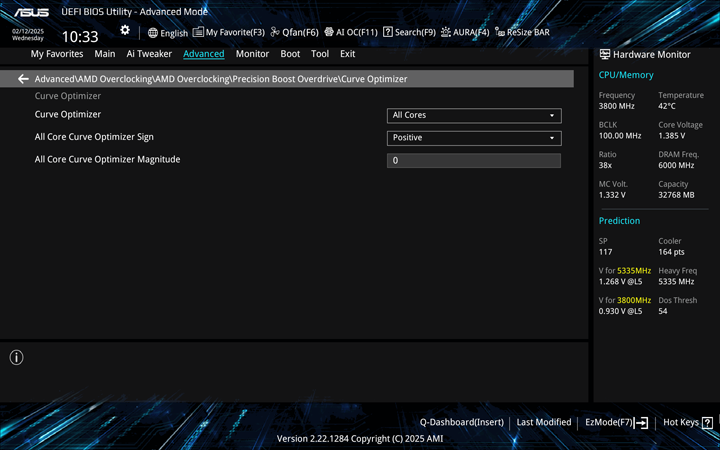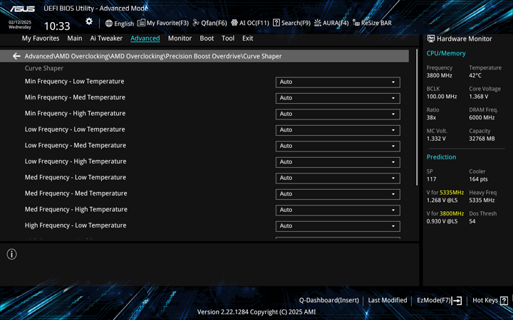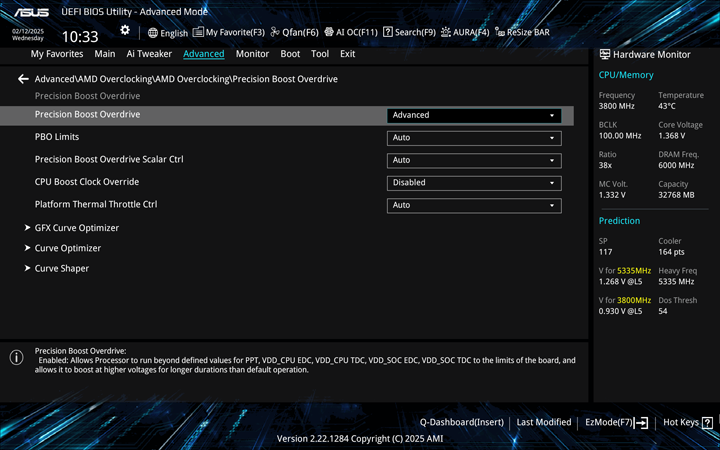 Under the Precision Boost Overdrive menu, you can set up enable and set up different limits. Enabling it already allows the processor to run above the defined limits of the CPU and towards the limits of the motherboard. Within this menu, you can select the Curve Optimizer and Curve Shaper. Curve Optimizer came with Ryzen 5000 series of processors, and it lets you tune the adaptive voltage and frequency scaling, or AVFS, curve of the CPU or specific cores. This is meant to let you tweak these fixed curves to potentially increase the CPU's performance. You can set the optimizer to apply to all cores, to specific cores, or to specific CCD. Curve Shaper is the latest addition with the Ryzen 9000 series as an add-on for Curve Optimizer. Here, you can get even more granular control to set specific voltage offsets based on different temperatures and frequencies.