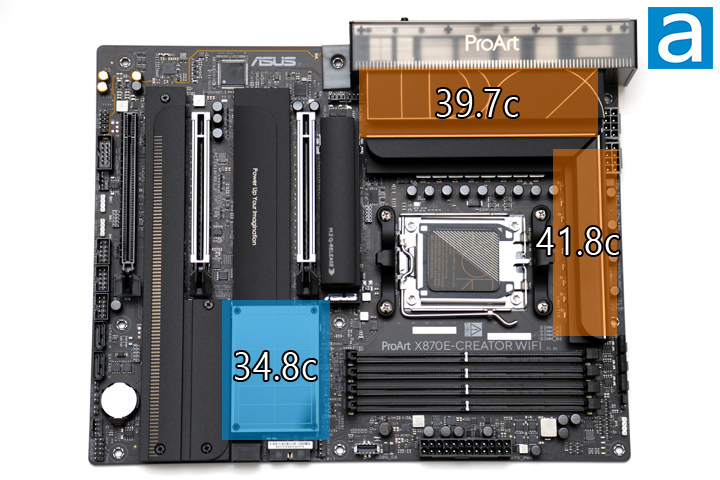 As we have already seen, the ASUS ProArt X870E-Creator WiFi has two chunky heatsinks over the 16+2+2 80A power stage design along with a passive heatsink over the X870E chipset. The X870E chipset has a 14W TDP, which does not require active cooling. For this test, I put the system under full load using Prime95 and used an Etekcity Lasergrip 800 infrared thermometer to measure the surface temperature of key areas of the motherboard after 30 minutes. The surface temperature of both VRM heatsinks came in under 50c, while the chipset heatsink measured only 34.8c, as shown in our above photo. I have not experienced any stability problems caused by heat while using this motherboard. I also scanned the surface of the entire motherboard using the infrared thermometer and there were no areas of concern or outliers on the ProArt X870E-Creator WiFi.