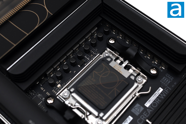 The first thing you might notice is that the ASUS ProArt X870E-Creator WiFi has many different heatsinks. This includes the VRM heatsinks over the MOSFETs and chokes near the processor socket, which we will take a deeper look at in a moment. All the NVMe M.2 slots have a heatsink with thermal pads underneath. An acrylic-covered passive cooler sits over the X870E chipset, which has a TDP of 14W. Thankfully, gone are the days of any active fans on the chipset. All these blocks of metals should help the ASUS ProArt X870E-Creator WiFi perform well thermally, even in cases with lacking airflow, but we will do some temperature testing later in this review.