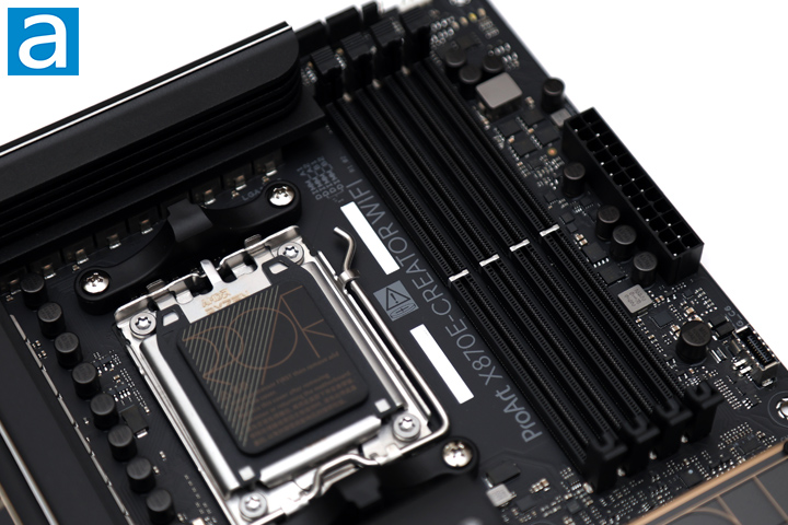 Here, we have the AM5 processor socket with the typical array of items in proximity. These are related to the CPU voltage regulator circuit as well as two corresponding heatsinks. The heatsinks are low profile considering their size, and I had no problems installing larger CPU coolers in this area. However, it does vary from model to model, as we have run into some compatibility issues in the past with air coolers on the ASUS ProArt Z690-Creator WiFi. ASUS ProArt X870E-Creator WiFi features a Digi+ VRM and a 16+2+2 80A power stage design for solid and precise power delivery with fast transient response to your CPU. Two more 4-pin chassis fan headers are a bit further out by the top M.2 slot near the southwest corner of the CPU socket.