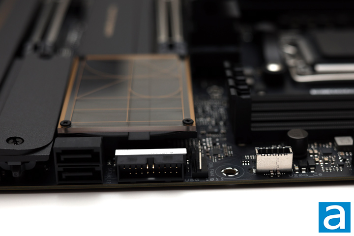 Continuing our way down the right side, the first connector is the USB 20Gbps header. This is compatible with Quick Charge 4+ and USB Power Delivery, and can deliver up to 30W of power. Next, there is a USB 5Gbps header, angled perpendicular to the motherboard. This makes connecting this fragile header a bit easier, since the cable does not need to protrude out as much. Finally, we have a pair of SATA 6Gb/s ports native to the chipset angled in the same way. It is a bit interesting to see less SATA headers than six on the motherboard, but this is just part of the trend towards more reliance on M.2 slots for storage rather than these older connections. The SATA ports on the ProArt X870E-Creator WiFi support RAID 0, 1, and 10. Overall, this is a pretty straightforward layout, and generally optimal in placement to ensure everything is on the edge for easier cabling.