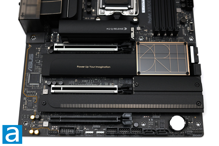 There is a total of three PCI Express expansion slots on the ProArt X870E-Creator WiFi. The top two slots are different from the third one in several ways. For one, they are both notably reinforced for increased strength. Secondly, they both have ASUS' Q-Release Slim latches at the end, which allow you to pull off your video cards easier by pulling from the back. This is because the latches are spring loaded to open with this motion. I personally would prefer an easy access button to unlatch the mechanism, but this is an interesting solution.