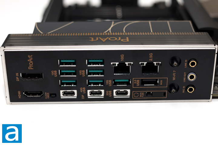 The back panel uses an integrated rear I/O shield and offers a generous array of modern external connectors. There is a total of seven USB 10Gbps Type-A ports. Nearby, there are two USB 40Gbps with support for USB Type-C display outputs. Next, there is a USB 20Gbps Type-C port. Finally, there is a single USB 2.0 header which is for BIOS flashing. A Marvell AQtion-based 10G Ethernet and Intel I226-V controlled 2.5G Ethernet are nearby. There are two buttons on this back shield with both marked clearly. One is to clear the CMOS, which makes it quite accessible to do so. The other is the BIOS flashback, which means you can update the BIOS without even needing a CPU installed.