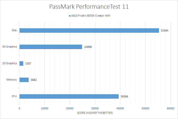 The third test is PassMark's PerformanceTest 11. This evaluates five different areas of our system, which includes the CPU, RAM, 2D Graphics, 3D Graphics, and Disk. It takes a different approach in obtaining results compared to other programs, which is why we like to use it. Unsurprisingly, the results were as expected for a system built with these components.