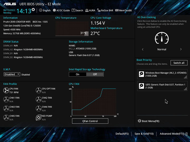 Before we begin, I updated the BIOS using ASUS' EZ Flash 3. EZ Flash 3 is an integrated feature for the user to flash their BIOS safely and easily. You can update using an image from any USB flash drive. With the ProArt Z690-Creator WiFi, you can also flash the BIOS without needing a CPU installed, which is handy. This method uses the Flashback button on the back of the motherboard. The sample we received came with the launch BIOS, and I have updated it to the 1505 BIOS without any issues.