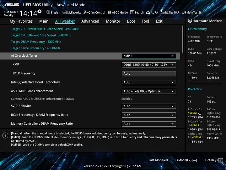 It should be no surprise the ASUS ProArt Z690-Creator WiFi's BIOS looks exactly the same as the one with the ProArt B660-Creator D4, as well as most other ASUS motherboards. However, you will notice there is even more tweaking you can do with the BIOS here, as we have the ability to overclock both the CPU and memory. If you have used ASUS products in the past, you will be quite familiar with the Ai Tweaker, as shown in our series of screenshots above. There is quite a bit you can play with. Changing anything can be done by inputting the values directly from your keyboard, so you will not need to scroll through a long list of numbers to find what you need. Alternatively, you can also hit the "+" or "-" keys on your keyboard to increase or decrease the selected value, respectively. The allowed voltage range and increments are shown at the bottom of your screen as you highlight the option you want to modify, which I find very helpful.