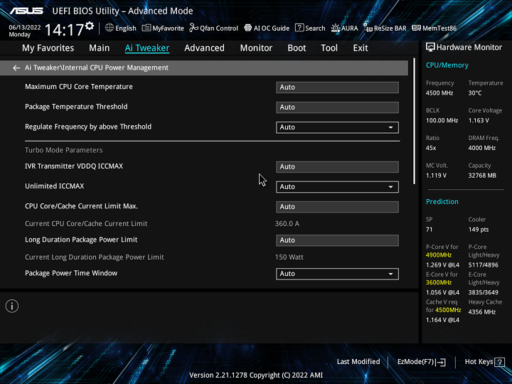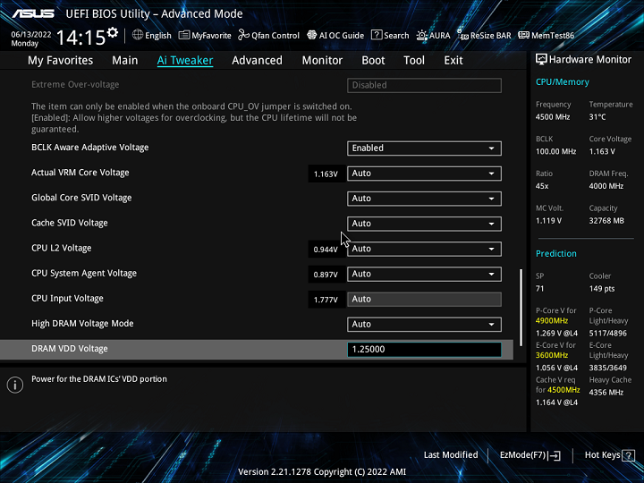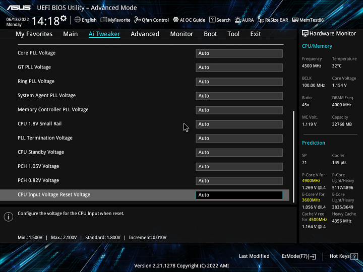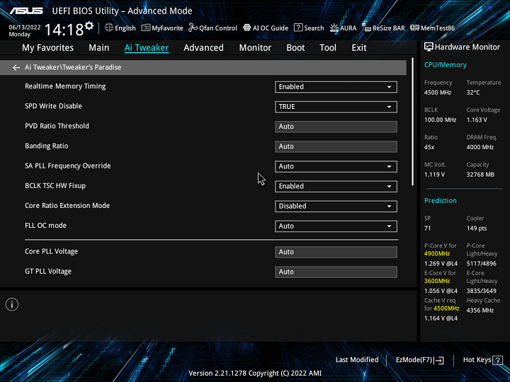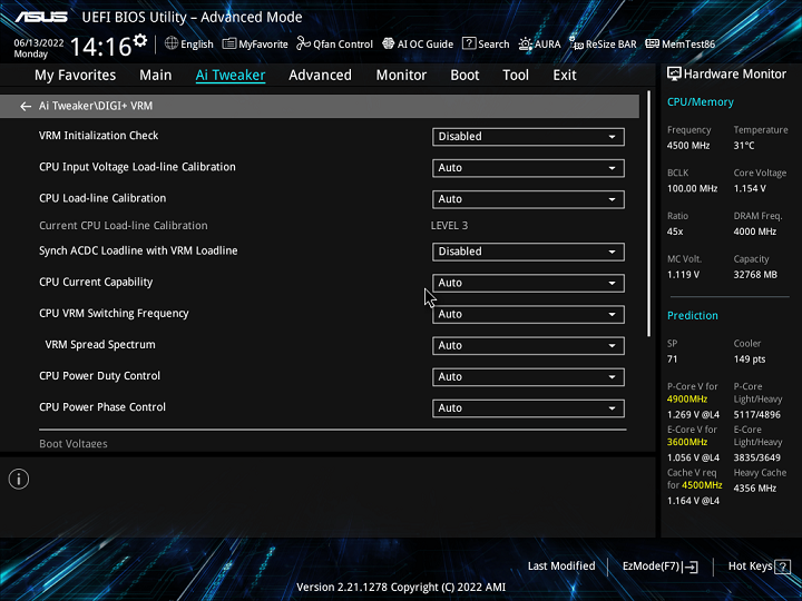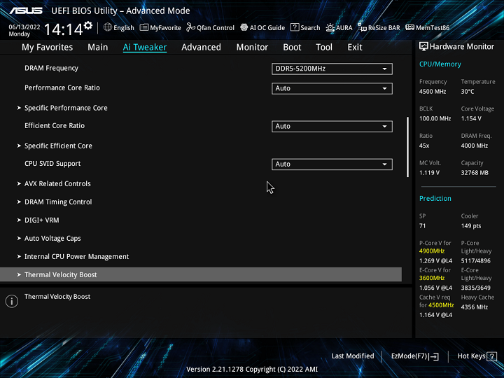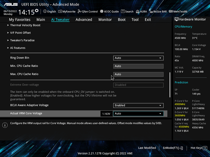 Other overclocking specific submenus are found under Ai Tweaker, including AVX Related Controls, Auto Voltage Caps, Thermal Velocity Boost, and V/F Point Offset. Each of these are useful in providing more fine-tuning to voltages and frequencies. Overall, the usage experience of ASUS' UEFI BIOS is excellent. The control interface is smooth and screen transitions are flawless. I am quite happy with the amount of voltage control the ProArt Z690-Creator WiFi provides.