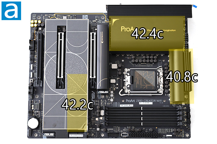 For this test, I put the system under full load using Prime95 and used an Etekcity Lasergrip 800 infrared thermometer to measure the surface temperature of key areas of the motherboard after 30 minutes. The surface temperature of both VRM heatsinks came in between 40.8c and 42.4c, while the chipset heatsink measured only 42.2c even without the large M.2 Q-Release heatsink. I have not experienced any stability problems caused by heat while using this motherboard. I further scanned the surface of the entire motherboard using the infrared thermometer and there were no areas of concern on the ProArt Z890-Creator WiFi.