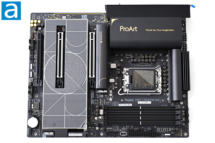 The ASUS ProArt Z890-Creator WiFi is a standard ATX board at 30.5cm by 24.4cm. It is the company's latest motherboard in the ProArt lineup, and it fits the design theme of the series very well. ASUS has been using flat black soldermask on their lineup for a very long time, and I found its understated appearance to be quite attractive in my windowed chassis. All of the components are in various shades of monochrome with flat gold lines over the large M.2 Q-Release heatsink, more lines and label on the small M.2 Q-Release heatsink, "Power Up Your Imagination" text on the left VRM heatsink, and ProArt branding on the chipset heatsink. Even the capacitors are black in color, which makes it very sleek in my opinion. The ProArt Z890-Creator WiFi is a performance board, and it certainly carries the classy vibe of one. While aesthetics is not really an issue when it comes to internal components of a computer compared to the way the board is built and how well it performs, surprisingly it can be a deciding factor for some users. Of course, the comments on the look are just a personal opinion. This motherboard has gone through a 168-hour durability test for long-term dependability.