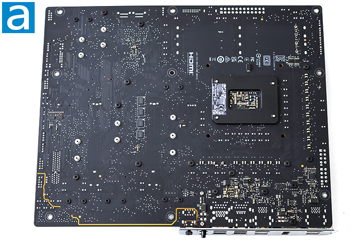 The ASUS ProArt Z890-Creator WiFi is an 8-layer PCB. Above is a shot of the motherboard at the back. The layout is relatively simple and clean, which is great for those thinking of adding aftermarket CPU cooling solutions. A standard Intel backplate is found here, and all LGA1851 aftermarket coolers should be designed to work with this backplate in place. Some sockets and headers use through-hole connectors, as shown in our photo above, for better handling of mechanical stress.