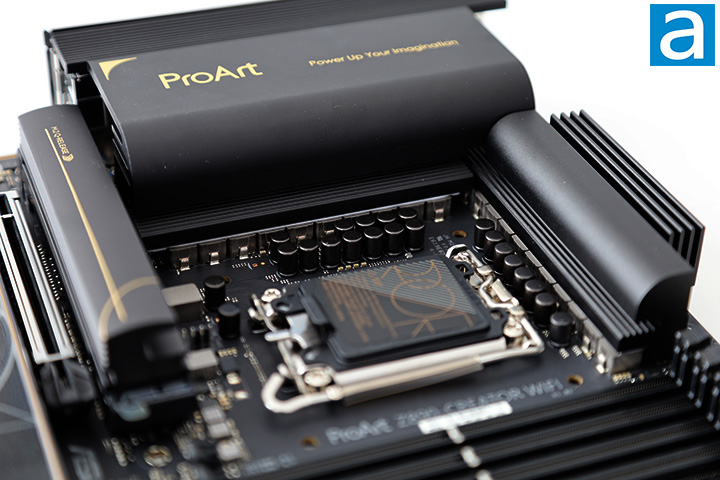 As you can see in the photo of the ASUS ProArt Z890-Creator WiFi above, the heatsink configuration is extensive. There are large VRM heatsinks for the MOSFETs and chokes around the processor socket, which we will cover in just a short moment. The PCIe 5.0-based NVMe M.2 slot has its own M.2 Q-Release heatsink, while the remaining four is covered by one large M.2 Q-Release heatsink. Lastly, a simple passive cooler is placed over the Z890 chipset behind the large M.2 Q-Release heatsink, since it only has a 6W TDP. The ASUS ProArt Z890-Creator WiFi will work just fine even in cases with not a whole lot of airflow. We will do some temperature testing later on in this review.