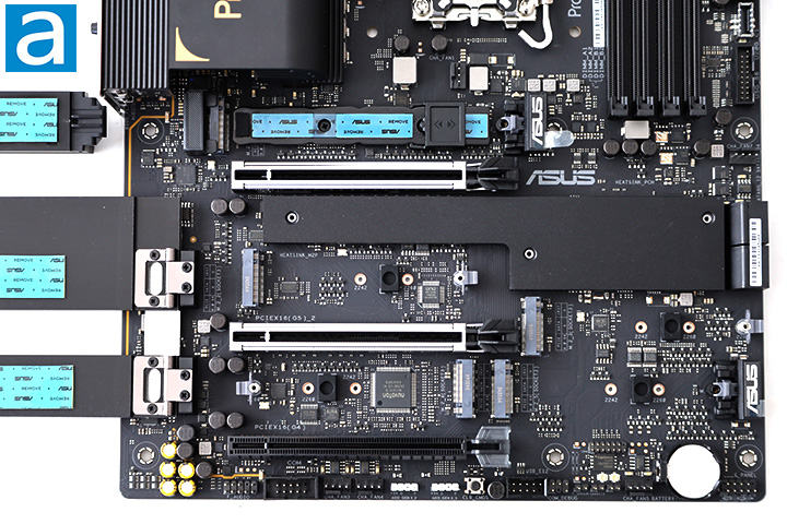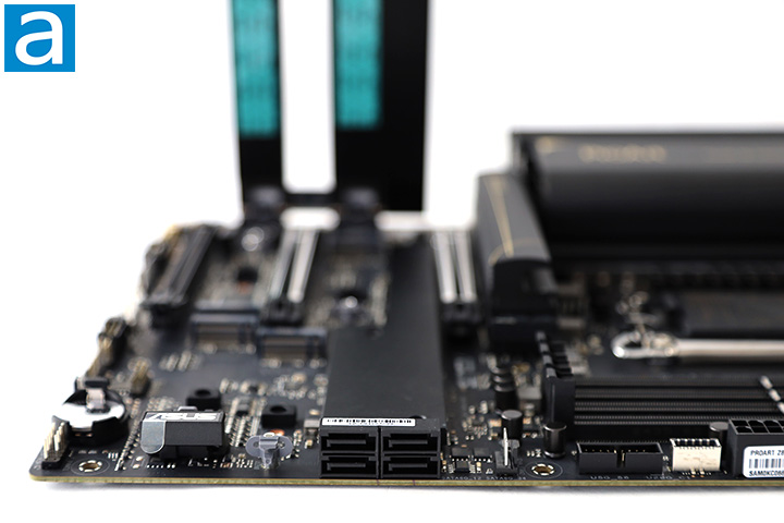 There are five M.2 storage slots on this motherboard, which provides a whopping amount of NVMe storage if you want to load your PC up with an array of fast SSDs. The top M.2 slot between the CPU and first PCI Express 5.0 x16 slot is PCIe 5.0-based, and supports SSDs sized up M.2 22110. As mentioned earlier, the PCIe 5.0-based NVMe M.2 slot Q-Release heatsink, which can be easily removed by a latch. The remaining four are PCIe 4.0-based and support sizes up to M.2 2280. All M.2 slots have nifty mechanisms for locking SSDs in place tool-free, which is very convenient and actually works well. The PCIe 4.0 M.2 slots are covered by one large M.2 Q-Release heatsink, which swings open like a door by a hinge on the left side of the motherboard. It looks great and provides a nice, clean look, but I ended up removing it entirely, since all my SSDs come with a heatsink from the factory, which prevents it from closing.