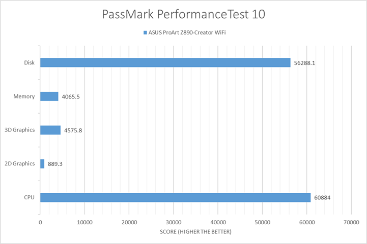 We run PassMark PerformanceTest 10 to evaluate five different areas of our system, which includes the CPU, RAM, 2D Graphics, 3D Graphics, and Disk. It takes a somewhat different approach in obtaining results compared to other programs, which is why we like to use it. Again, the results were expected for a system built with these components.
