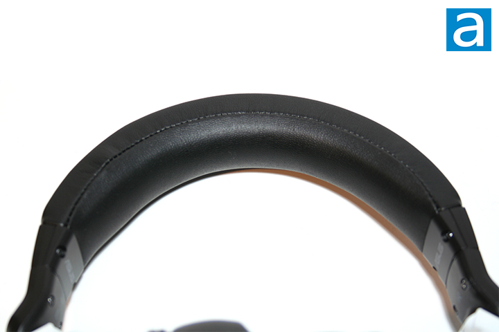 Moving up, we can see that the arms on the ASUS ROG Delta S Wireless can extend out to optimally fit the size of your head. There are visible marks on the sides to indicate how far out the headphones can extend. The arms are notched as well, so you can get an idea of how far the arms have extended. The rest of the headband is made out of protein leather with steel underneath. The protein leather here is thick and creates a nice cushion that can rest on the top of your head. This also helps reduce the amount of pressure that can be felt from the top. Text indicating the left and right earcups is engraved on the lower ends of the arms with the ASUS logo printed above.