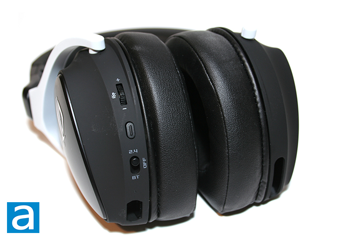 The bottom of the headset contains the control buttons most headphones these days would come with. All the controls are located on the left ear cup, with these controls being the analog volume wheel and a media control button. The analog volume wheel allows users to control the maximum volume of these headphones. The same volume wheel can also be pressed, which will mute or unmute the output. The dedicated media button has a few different functions to it. Pressing it once will pause or resume playing music or media, pressing it twice will skip to the next song, and pressing it three times will restart the song. We can also see the wireless controls, which comes in the form of a sliding button. There are three states, with one being the 2.4GHz RF connection, second being a Bluetooth connection, and the last to power off the device.