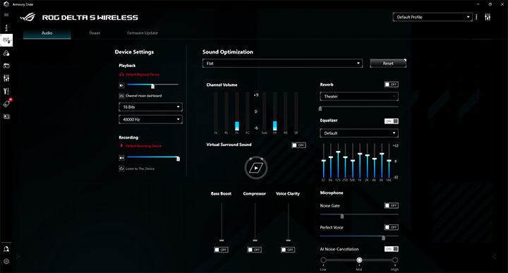 Armoury Crate is the latest software by ASUS that allows you to monitor and modify compatible products. The download process was easy and straightforward with no issues. There is a lot going on with this software, so I will do my best to explain all the features. Starting with the basic device settings, users can adjust the volume of the playback device, change the attributes of the channel, and adjust the volume of the recording device. Users can choose sound optimization options that work best for them, with some of these options including Communication, Flat, Gaming, and Movie. The channel volume of each side can be seen along with other settings such as the reverb and equalizer. The virtual surround sound can be toggled on and off along with bass boost, compressor, and voice clarity, with these three selections allowing users to choose a level that suits them best. Finally, microphone attributes such as the noise gate, perfect voice, and AI noise-cancellation can also be toggled and set to a certain level once activated.