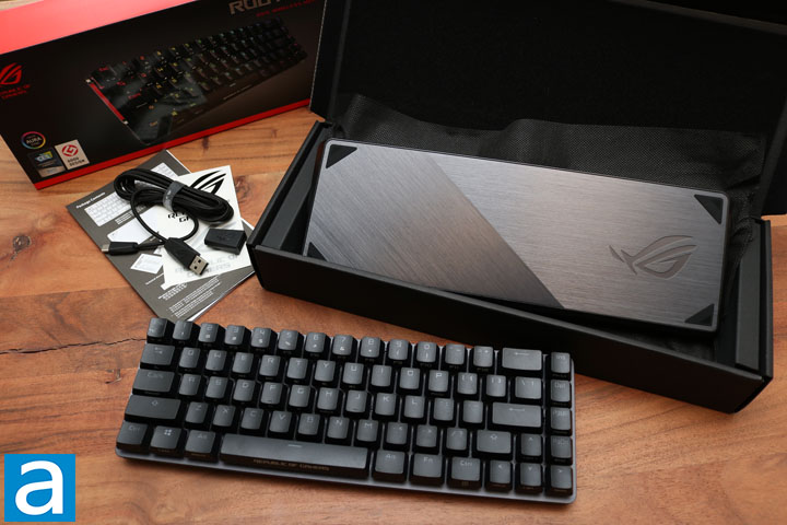 The ROG Falchion NX is packed excellently. The retail box opens on the side revealing an inner black box. This inner box opens up on one side revealing the keyboard in a cloth cover. The lid of the black box has a thin foam layer to provide some extra protection for the product. Other than the keyboard, there is a metal and plastic keyboard case, which protects the keyboard if you transport it anywhere. The plastic case can be placed underneath the keyboard when not in use, ensuring you will not lose it. Other than that, there is a USB Type-C cable to charge the device, small USB wireless dongle, and a wireless dongle extender. A quick start guide and a sticker is included as well.
