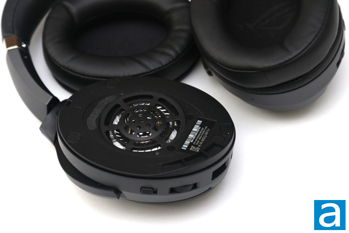 Starting at the ears of the ASUS ROG Fusion II 500, the cups are covered in synthetic leather. Inside, there is a notable amount of foam to increase the comfort. Each ear cup is also lined with a mesh lining to prevent your ears from rubbing the plastic underneath. As you have seen already, another set of ear cups are included with a mesh fabric cover for a different feel. I personally prefer the airy feel of the fabric rather than the protein leather, but I appreciate that ASUS has provided both for users to pick between. These are over-ear headphones, so the ear cups sit around your ears rather than pressing on them. Underneath, you can see the plastic frame and the exposed driver for each ear. These 50mm neodymium drivers have a frequency response of 20Hz to 40kHz and an impedance of 32Ω. As these can plug into your computer via USB, ASUS also advertises the internal ESS9280 amplifier and DAC, which are probably found in one of the ears. Finally, these ears swivel on the headband, as you can see in the photo above, so you can rest the headphones on your neck while keeping a lower profile.