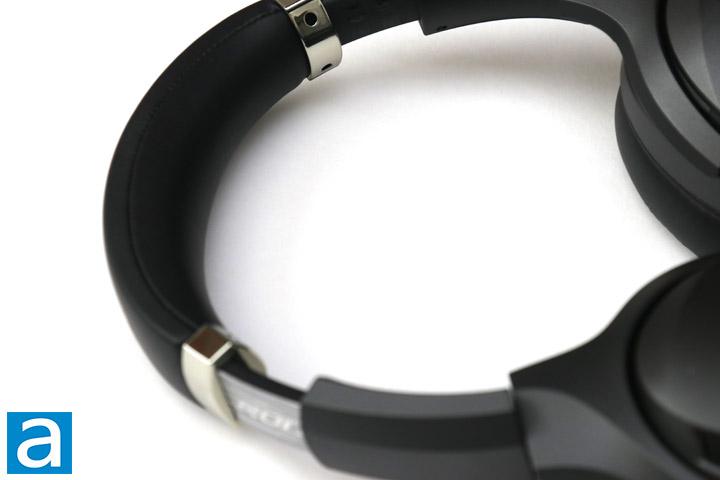 From here, you can get a better picture of the ASUS ROG Fusion II 500 headband. With extending arms on each side, the protein leather headband at the top sits with foam inside to create a gentle resting spot at the top. Moving down, the arms extend out to reveal the metal band inside, which helps with the structure and rigidity. The arms extend out with a notched feel, but there are no visual indicators to show users how much the arms have extended, other than the ROG logo.