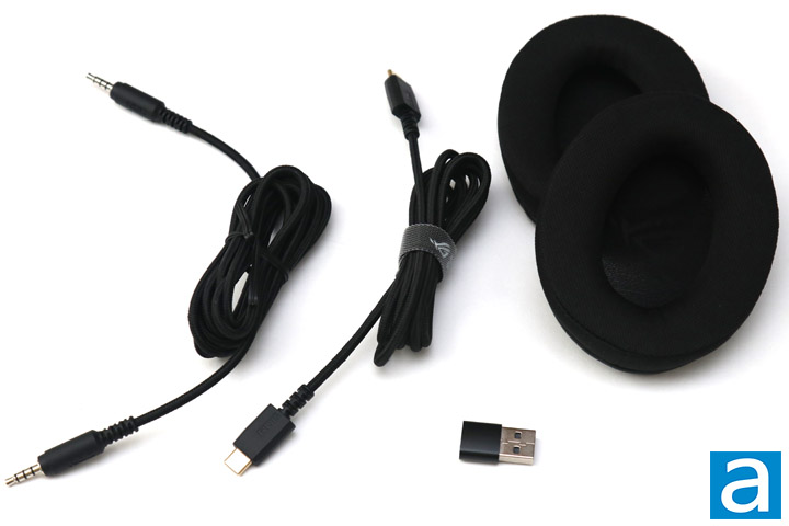 As I have mentioned several times, ASUS has provided several accessories with the ROG Fusion II 500. The first set are the two cables, which is a 3.5mm audio cable followed by a USB Type-C to USB Type-C cable. The 3.5mm audio cable measures about 1.9m in length, while the USB cable is closer to 1.5m. Since you can use either for connectivity, I wish the USB cable was longer, as I found it just a bit too short for use with my desktop, even when I used it with the front panel USB ports. Both of these cables are braided to improve the durability. Next, we have a USB Type-C to Type-A adapter, which will let you connect to the full-sized port if you need to. Finally, we have the aforementioned fabric earcups with a thick amount of foam inside for added comfort.