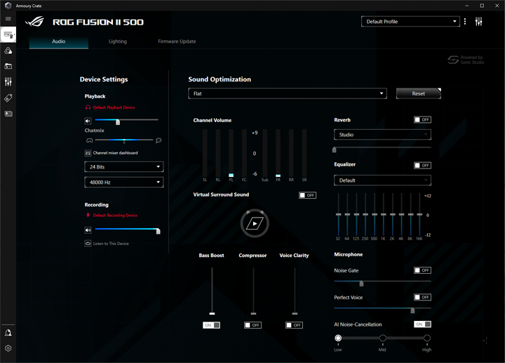 After selecting the gaming headphones to modify, there are several tabs within this configuration page. The first one is called Audio, and this is where you can change all of the audio settings. You can see different Device Settings, including modifying inputs and outputs with the ROG Fusion II 500. In the middle, we have the Sound Optimization area where users can monitor the volume while also enabling virtual surround sound, bass boost, compressor for a more consistent volume range, or voice clarity for improving vocals in movie or music playback. Down the right side, users can also add some reverb, change equalizer settings, as well as microphone settings. There is quite a bit of customization available for the ROG Fusion II 500. The next tab is marked Lighting, where users can change the lighting effects and colors on the back strips of the headphones. Finally, the Firmware Update tab is a link to direct you to the necessary updates you may need to install for future updates. After using Armoury Crate for some time, I found the software to be a bit resource heavy. You can also use the headset without Armoury Crate, if you so desire.