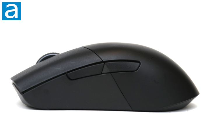 From the left side perspective of the ASUS ROG Keris Wireless, you can see almost all of the buttons you have access to when holding the mouse. The primary buttons at the top are separated from the rest of the body to ensure a faster clicking feel. Underneath each primary button is an ROG Micro switch with a seventy million rated click endurance. Compared to Omron switches, I found the ROG Micro switch to feel a bit lighter in the press with a less clicky sound. If you so desire, you can swap out the switches easily by taking apart the mouse and swapping them out.