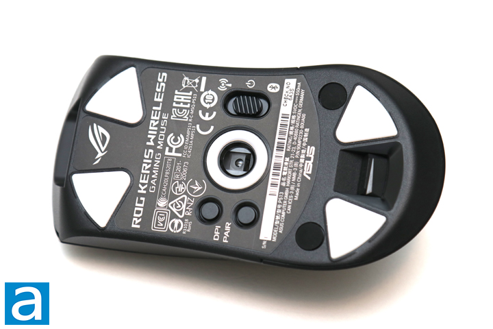 Beside the sensor is a switch to switch the operating modes of the ASUS ROG Keris Wireless. If you leave it in off, you can still operate in wired mode. On the left side of the sensor are two flat buttons, each marked for what they do. The DPI button lets users cycle between a set of sensitivities. This set can be changed in the Armoury Crate software, as you will see shortly. The Pair button is meant to let users pair their mouse to connect in Bluetooth mode. There are two rubber pads near the back. These pads cover two screws to let users open up the Keris Wireless to change the aforementioned switches. Finally, at the back is a plastic slot for you to store the wireless USB transceiver when you are not using it.