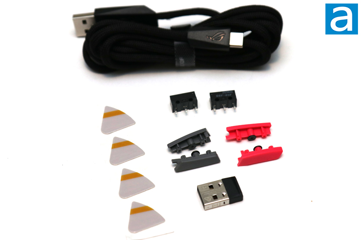 Wireless may be in the name, but ASUS has provided a 2m paracord for greater flexibility, both in terms of connectivity options and the cable itself. I really like this paracord cable because it is flexible and does not catch on table edges. It also is very light so that it does not create much drag. It terminates in a Type-C connection on one end and Type-A on the other. Other accessories included with the ASUS ROG Keris Wireless include a pair of Omron switches to swap out the primary ones if you want, a set of four replacement PTFE feet, and two more plastic side buttons in gray and red. The two side buttons on the Keris Wireless are easily replaceable as they are held on by magnets. They hold surprisingly well to the side, but pop off if you like to swap to a different color.