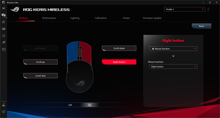 After selecting the mouse to modify, there are several tabs within this configuration page. The first is marked Buttons and this lets you set different actions to set for each of the buttons on the mouse. The only button you cannot reconfigure is the primary left button. The macro creation is done on a separate page where you can combine and record keyboard and mouse actions into a single key press. The second tab is Performance, where users can change the DPI sensitivity levels, polling rate, and button response time. The sensitivity can be modified in 100 DPI increments within a range of 100 to 16000 DPI. The third tab is Lighting, where users can modify the different lighting effects for this mouse, choosing between various static and dynamic modes, as well as responsive or non-responsive ones. You can also choose to split up the effects based on the two zones of lighting. If AURA Sync is enabled for the Keris Wireless, the modifications of lighting effects are done on another page. A second application called AURA Creator can be used to further customize the lighting if you so desire. The fourth tab is Calibration, but this is just a single page to modify lift off distance. There are two settings marked Low or High. I would have liked to see this combined with the Performance page. The fifth page is labeled Power and it shows the current battery percentage, sets lighting alerts for battery percentage levels, and sleep mode timers when the mouse is idle. Finally, the last page is marked Firmware Update, which can direct you to the necessary updates you may need to install for future updates.