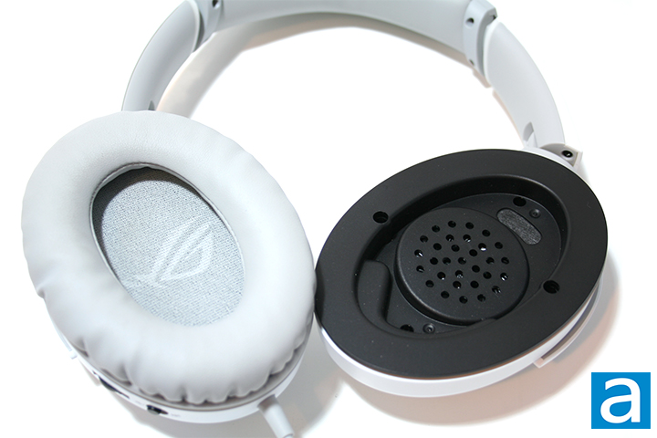 Moving on to the ears, the cups are wrapped in PU leather, which I found comfortable enough in day-to-day use. The ASUS ROG Strix Go Core Moonlight White ears are oval-shaped, which should fit over most ears. Underneath the surface, the Go Core Moonlight White uses neodymium magnet drivers. The frequency response is not listed, but the impedance is rated at 32Ω. The arms the ears sit between can tilt to best fit your head. As mentioned earlier, the earcups on the Go Core Moonlight White can rotate and bend so they rest flat if you wear the headset around your neck. This also makes it easier to carry around.