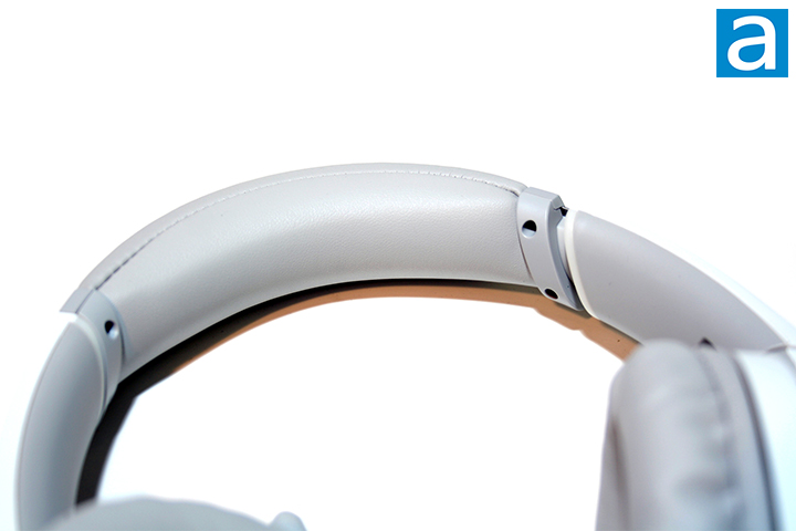 Moving up, we can see that the arms on the Go Core Moonlight White can extend out to optimally fit the size of your head. There are no visible marks to indicate how far out the headphones can extend. The arms are notched though, so you can at least get an idea of how far the arms have extended. The rest of the headband is made out of PU leather with steel underneath. The PU leather here is thick and creates a nice cushion that can rest on the top of your head. This also helps reduce the amount of pressure that can be felt from the top. Text indicating the left and right earcups is engraved on the lower ends of the arms.