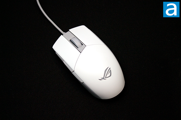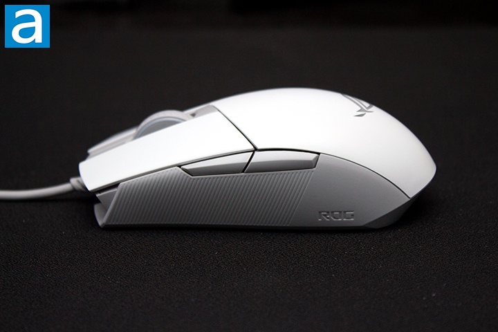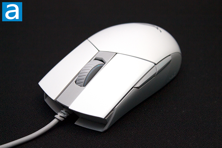 In between the primary left and right buttons, there is a textured scroll wheel. The sides have a thin translucent edge, allowing the lighting to shine through. The scroll and click of the wheel are quite nice, rotating with a good amount of resistance and having a snappy response. On the side of the mouse, we have two secondary buttons mapped to Forward and Back by default. I found these sided buttons to be much squishier compared to the two primary buttons. The side buttons were placed out of the way enough to avoid accidental presses, although this will vary from person to person. Finally, at the top, there are two translucent windows. It is a small but pleasing addition to the ASUS ROG Strix Scope Impact II Moonlight White in my opinion.