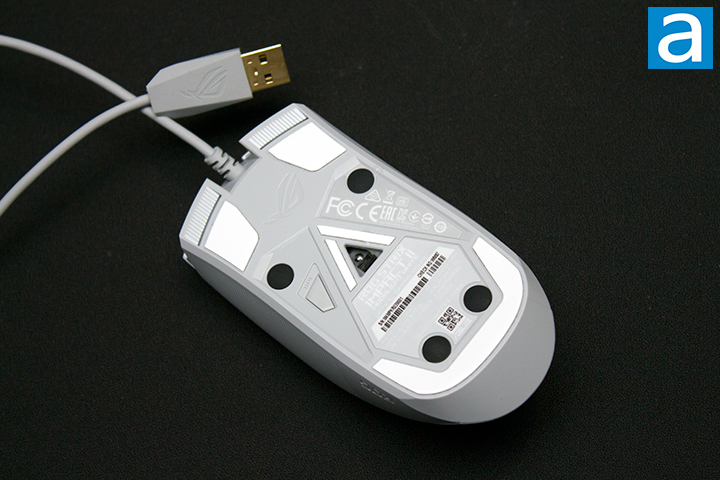Underneath the ASUS ROG Strix Scope Impact II Moonlight White, you will see quite a few important characteristics. We have five PTFE, otherwise known as Teflon, pads with three feet and two strips around the sensor. These feet are intended to provide a good gliding performance. We also have a better view of the cable. This is a USB 2.0 cable that is not braided. I would have appreciated a braided cable ,as they are more durable and would look better when paired with the other Moonlight White peripherals like the ROG Strix Scope NX TKL Moonlight White.