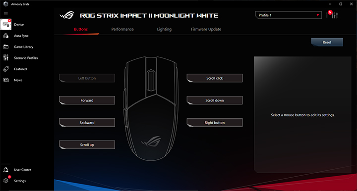 After selecting the mouse to modify, there are several tabs within this configuration page. The first tab is named Buttons and lets you reconfigure all buttons, including scrolling, except for the primary left button. The second tab is Performance, where users can change the DPI sensitivity levels, polling rate, button response time, and angle snapping. The sensitivity can be modified in 100 DPI increments within a range of 100 to 6200 DPI. The third tab is Lighting, where users can modify the different lighting effects for this mouse, choosing between static or dynamic effects, as well as responsive or non-responsive ones. You can also download Aura Creator to gain access to some advanced effects. The last page is Firmware Update, which will give you access to the necessary updates.