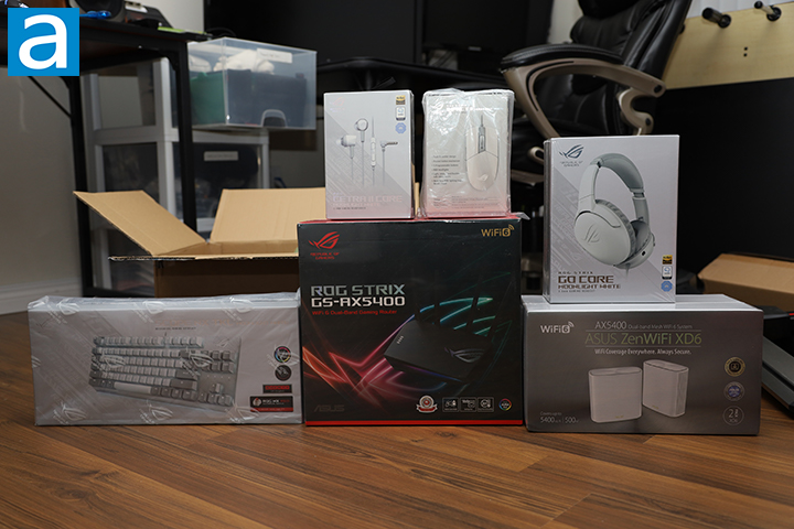 Our review unit of the ASUS ROG Strix Scope NX TKL Moonlight White came in a brown, corrugated box that was shipped all the way to us in Calgary, Alberta, all the way from Newark, California via FedEx International Priority. The shipping was quite good, having very little marks or dents and ASUS used their branded packing tape to ensure there was no tampering. The box also contained the ROG Strix Scope Impact II Moonlight White, ROG Strix Go Core Moonlight White, ROG Cetra II Core Moonlight White, ROG Strix GS-AX5400, and ZenWiFi XD6, which my colleagues and I will review later.