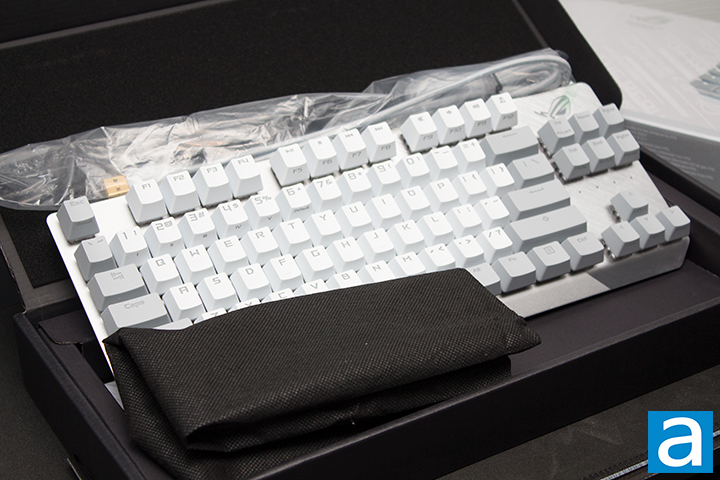 Out of the box, you will receive the ASUS ROG Strix Scope NX TKL Moonlight White itself alongside the braided cable, quick start guide, warranty booklet, and the incredibly important sheet of ROG stickers to slap on to your gaming PC. The keyboard was wrapped in a nice fabric bag to prevent any surface scratches on the keyboard, while the cable was wrapped in plastic. The quality of packaging was significantly better than anything I had expected, as the top of the box had some additional cushioning, which you can see in the image above. The packaging was nice and simple, while having some nice additions to maintain the safety of the keyboard.
