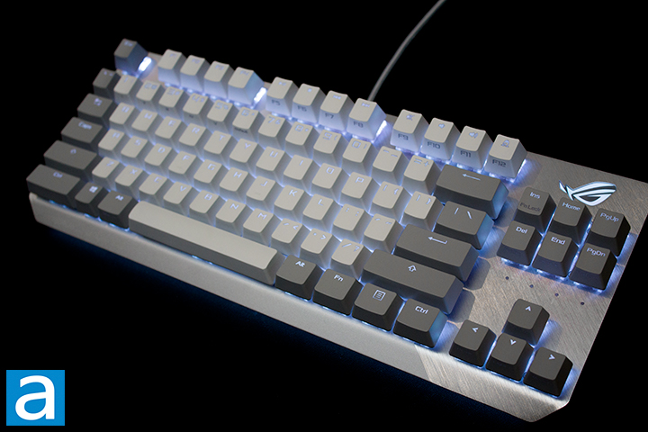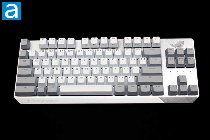 The appearance of the ASUS ROG Strix Scope NX TKL Moonlight White is quite clean, splitting the backplate into two portions: One being a lighter grey and the other being grey brushed aluminum. The brushed aluminum adds a bit of contrast in the keyboard, making it look not overly flat. Underneath the backplate, we find a nice plastic casing. I absolutely love the appearance, as it will pop out in many desk setups. Not many people utilize a white keyboard for the reason that it is hard to maintain. As someone who has been using a mostly white keyboard, I have found no issue with it. Most users should not find issue with the white as long as you follow the rule of “no eating by the keyboard”. ASUS opted to place the ROG logo on the top right of the keyboard, effectively removing some less commonly used keys, such as the Print Screen, Scroll Lock, and Pause keys. The ROG Strix Scope NX TKL Moonlight White does not come with a wrist wrest, which would have been appreciated given the flatter typing angle.